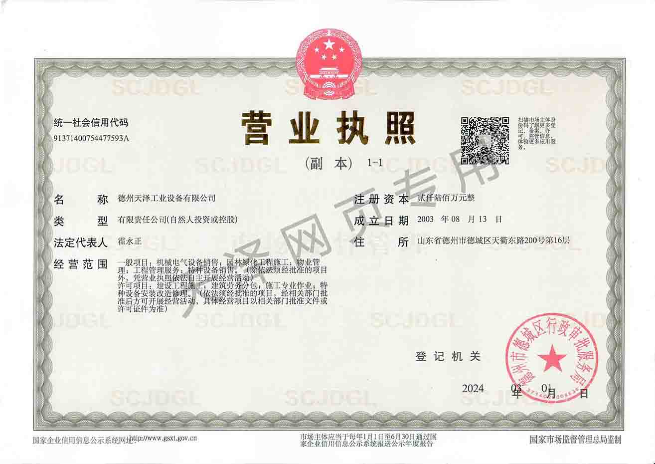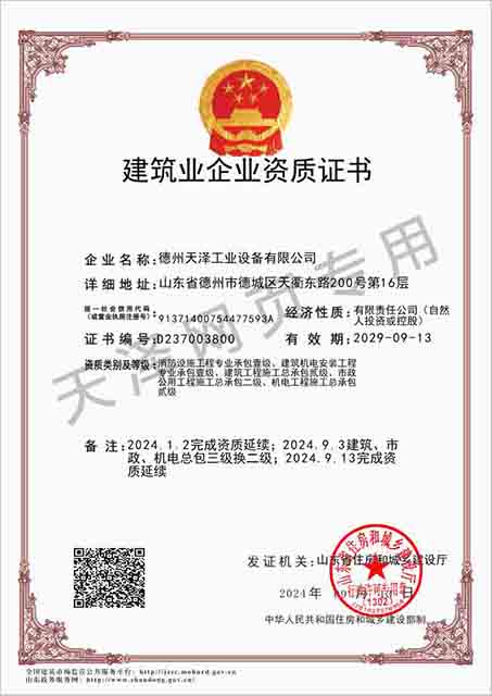 德州天澤工業(yè)設(shè)備有限公司成立于2003年(前身為德州天元集團(tuán)天明工業(yè)設(shè)備安裝公司),經(jīng)過20多年的發(fā)展,現(xiàn)成長為擁有職工600余人,各類專業(yè)技術(shù)人員近300余人,年生產(chǎn)能力兩億元以上,以建筑機(jī)電安裝工程、消防設(shè)施安裝工程施工為主,集建筑工程施工、市政工程施工、建筑智能化工程施工、園林綠化工程施工、工程管理服務(wù)、物業(yè)管理、電氣機(jī)械設(shè)備銷售等多元化經(jīng)營于一體的綜合型企業(yè)。2005年,企業(yè)按照國際標(biāo)準(zhǔn)建立的質(zhì)量管理體系,通過了ISO質(zhì)量管理體系認(rèn)證、環(huán)境管理體系認(rèn)證、職業(yè)健康安全管理體系認(rèn)證。施工工程遍布山東、河北、四川、江蘇等地,最具代表性的工程有:山東省德州市百腦匯資訊廣場機(jī)電安裝工程、德州經(jīng)濟(jì)開發(fā)區(qū)天元大廈機(jī)電安裝工程、陵城區(qū)人民醫(yī)院機(jī)電安裝工程、德州金魯班大廈機(jī)電安裝工程、河北故城金辰小區(qū)機(jī)電安裝工程、北川地震災(zāi)后援建工程等。多年來,公司始終堅(jiān)持“以人為本,建精品工程,創(chuàng)行業(yè)品牌”的經(jīng)營理念,先后榮獲。ㄊ校┘壧┥奖、天府杯、魯安杯等獎項(xiàng),申報(bào)各種功法、多項(xiàng)專利。